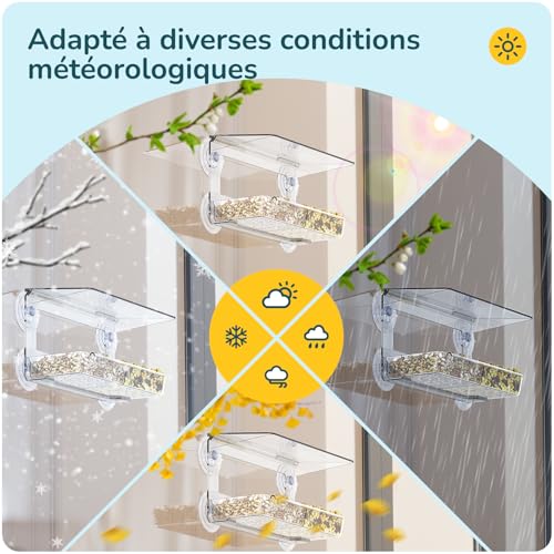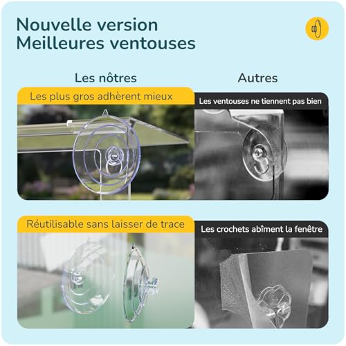 Ventouse puissante : cette mangeoire à oiseaux est conçue avec 4 ventouses super puissantes, et nous fournissons une ventouse de rechange supplémentaire pour la maintenir en place même si de nombreux oiseaux mangent en même temps. Si robuste, il peut même être utilisé comme mangeoire pour écureuils