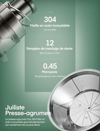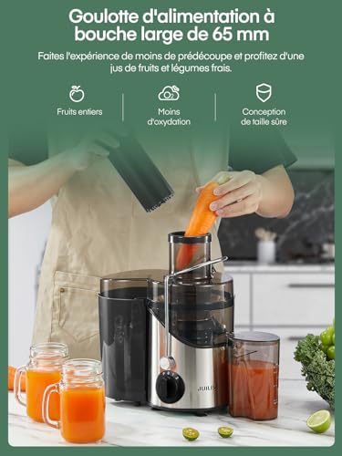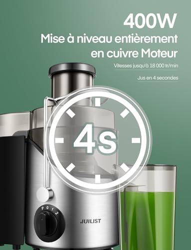 🍓【Moteur Puissant】JUILIST extracteur de jus est équipé d’un moteur amélioré d’une puissance maximale allant jusqu’à 800 W, vous permettant de déguster un jus maison sain en quelques secondes. La vitesse de fonctionnement est plus rapide que celle des autres produits de 800 W. Il est efficace et pratique, et peut facilement maximiser le rendement en jus et maximiser vos performances.Rendement maximal du presse-agrumes.