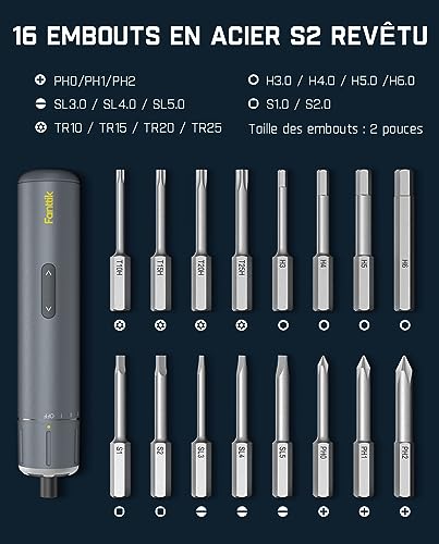 Fanttik S1 Pro Tournevis électrique, 3.7V Visseuse Sans Fil, 16 Foret Magnétique en Acier S2, Charge USB-C, mini visseuse sans fil de Phone, Caméra, Montres