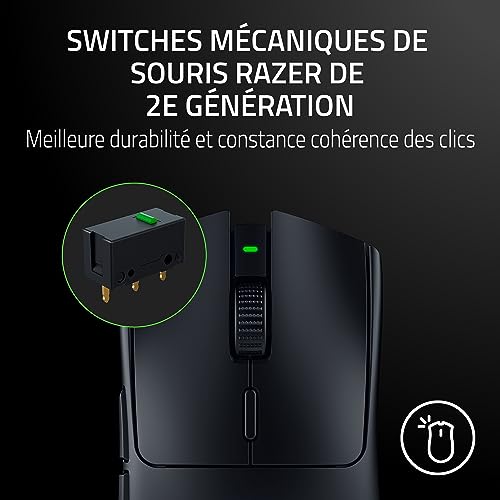 Switches mécaniques de souris Razer de 2e génération Meilleure durabilité et constance des clics. Les switches sont équipés de points de contact plaqués or pour une grande résistance à l’usure, offrant 60 millions de clics de durée de vie : profitez d’une précision sans faille dans le clutch